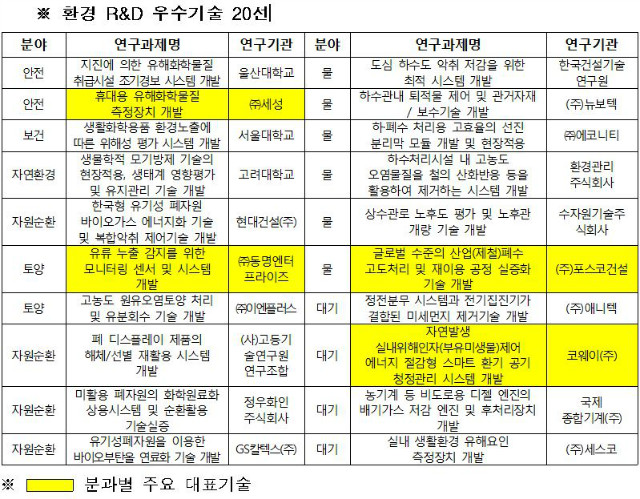 '환경 R&D 우수기술 20선'은 국민 생활과 밀접한 생활(안전, 보건), 자연, 물, 대기기후환경 등 4개 분과별로 구성됐으며, 최근 3년간(2016~2018) 종료됐거나 계속 진행 중인 과제 500여건 중에서 선정됐다.