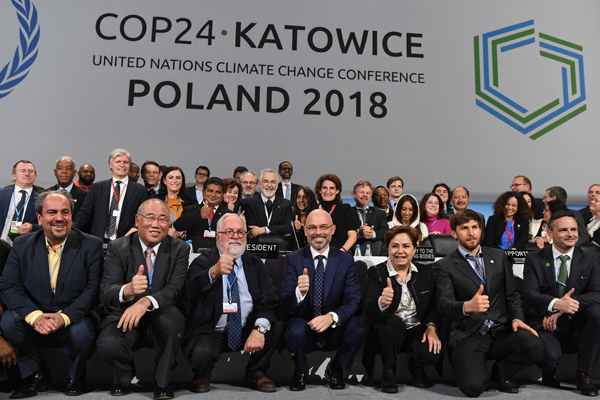 15일(현지시간) 폴란드 카토비체에서 열린 제24차 유엔기후변화협약 당사국 총회(COP24) 폐막식에서 이번 총회 의장을 맡은 미나우 쿠르티카 폴란드 환경차관(왼쪽 4번째) 등 참석자들이 엄지를 들며 포즈를 취하고 있다. (사진=(c) EPA/연합뉴스)