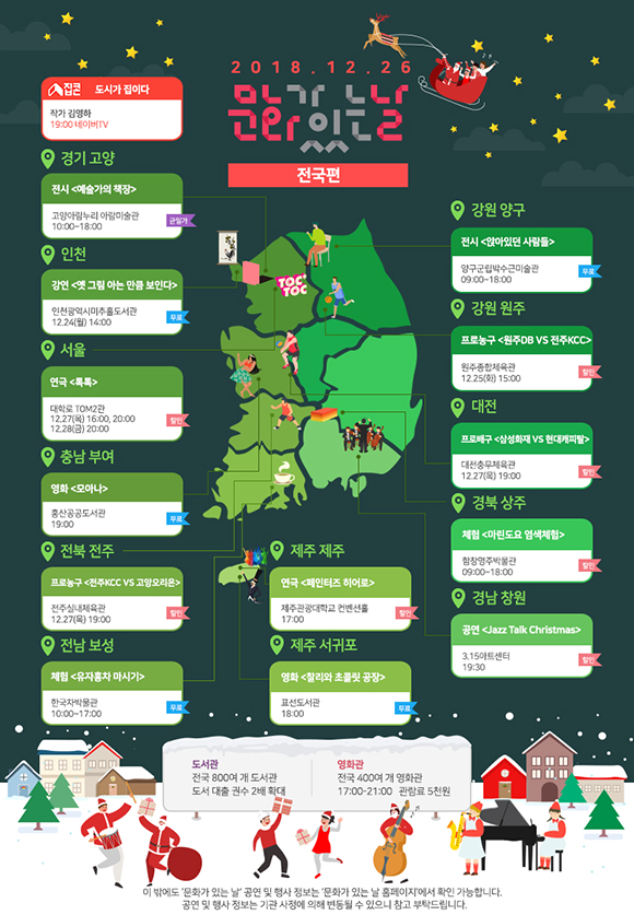특히 12월 26일은 올해 마지막 문화가 있는 날로, 크리스마스가 포함된 해당 주간(12월 24일∼12월 30일)동안에는 전국 곳곳에서 1930개의 문화행사가 열릴 예정이다.