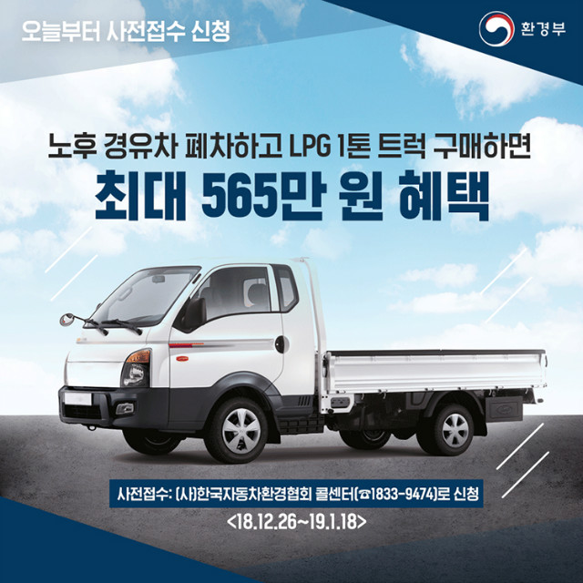 [일간환경연합 김경훈 기자]환경부는 26일부터 내년 1월 18일까지 ‘LPG 1톤 트럭 전환사업’ 사전 신청자를 모집한다.