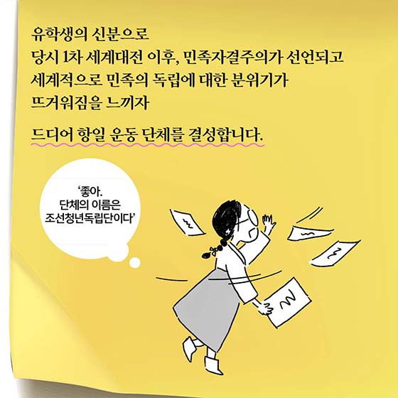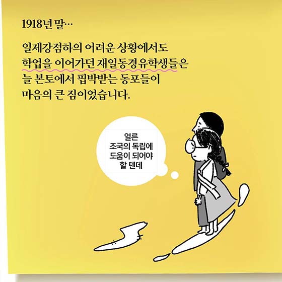 조선청년독립단이란 1918년 일본 동경에서 유학생들이 만든 항일 단체입니다. 1918년 말, 일제강점 하의 어려운 상황에서도 학업을 이어가던 재일동경유학생들은 늘 본토에서 핍박받는 동포들이 마음의 큰 짐이었습니다.