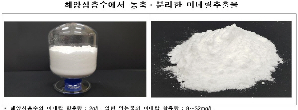 지난 2017년부터 해양수산부가 수행한 미네랄추출물의 독성평가 등 연구결과와 국외 사용현황, 제조방법, 원료의 특성자료 등을 토대로 식약처의 심사를 거쳐 해양심층수 미네랄추출물이 새로운 식품원료로 인정되었다.