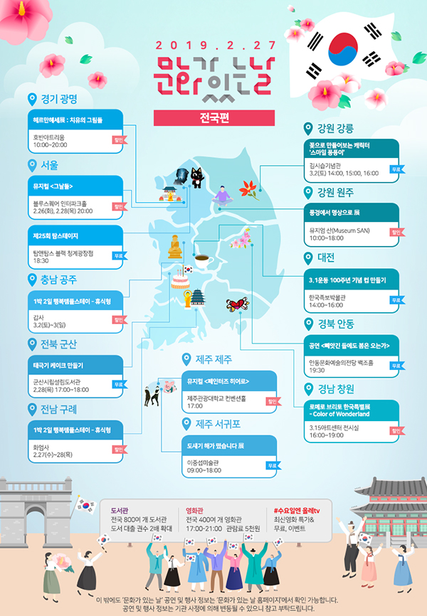 [일간환경연합 한선미 기자]2월 ‘문화가 있는 날’인 오는 27일을 전후해 1839개 문화행사가 전국 주요 문화시설 등지에서 펼쳐진다.