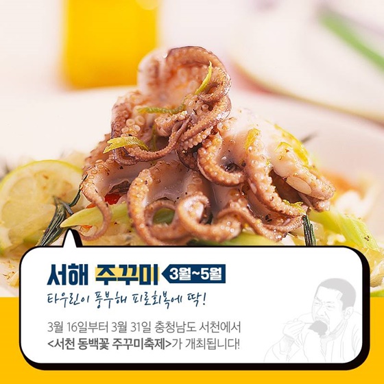 1. 서해 ‘주꾸미’ (3월~5월)타우린이 풍부해 피로회복에 딱인 주꾸미! 3월 16일부터 3월 31일까지 충청남도 서천에서 ‘서천 동백꽃 주꾸미 축제’가 개최됩니다.