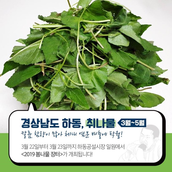 2. 경상남도 하동 ‘취나물’ (3월~5월)칼륨 함량이 많아 체내 염분 배출에 탁월! 3월 22일부터 3월 23일까지 하동공설시장 일원에서 ‘2019 봄나물 장터’가 개최됩니다.