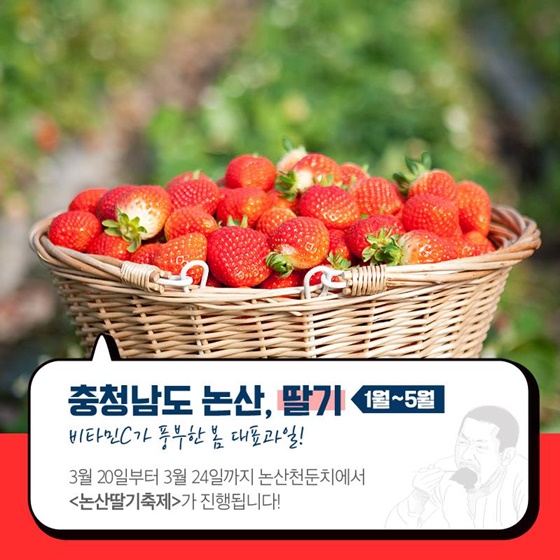 3. 충청남도 논산 ‘딸기’ (1월~5월)비타민C가 풍부한 봄 대표 과일! 3월 20일부터 3월 24일까지 논산천 둔치에서 ‘논산딸기축제’가 진행됩니다.