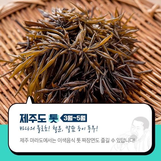 4. 제주도 ‘톳’ (3월~5월)바다의 불로초 ‘톳’은 철분, 칼슘 등이 풍부! 제주 마라도에서는 이색음식 톳 짜장면도 즐길 수 있습니다.