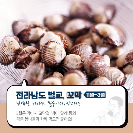 5. 전라남도 벌교 ‘꼬막’ (11월~3월)단백질, 비타민, 필수아미노산까지! 3월은 막바지 꼬막 철! 냉이, 달래 등의 각종 봄나물과 함께 먹으면 좋아요.