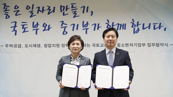 김현미 국토교통부 장관과 홍종학 중소벤처기업부 장관이 좋은 일자리 창출을 위해 지난해 11월 업무협약을 체결했다. (사진=국토교통부) |