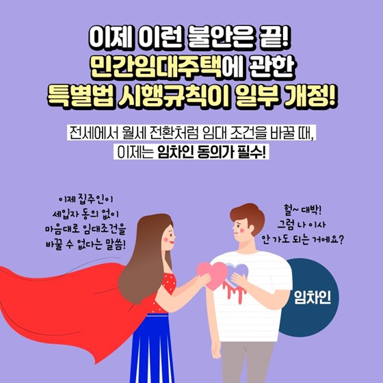 이제 이런 불안은 끝! 민간임대주택에 관한 특별법 시행규칙이 일부 개정되었습니다. 전세에서 월세 전환처럼 임대 조건을 바꿀 때, 이제는 임차인 동의가 필수입니다.