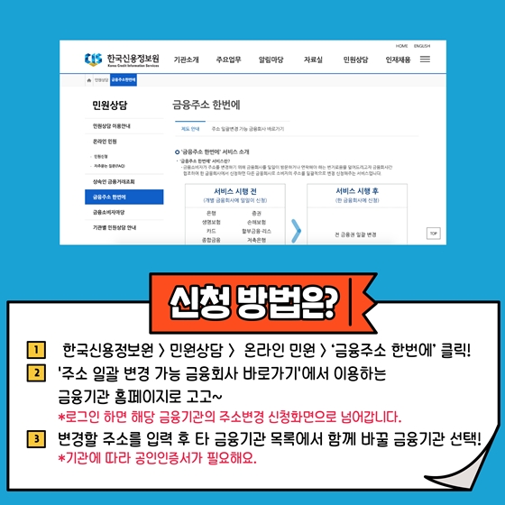 ① 한국신용정보원 > 민원상담 > 온라인 민원 > ‘금융주소 한번에’ 클릭!