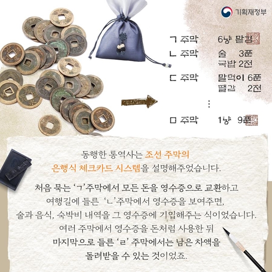 처음 묵는 ‘ㄱ’주막에서 모든 돈을 영수증으로 교환하고 여행길에 들른 ‘ㄴ’주막에서 영수증을 보여주면, 술과 음식, 숙박비 내역을 그 영수증에 기입해주는 식이었습니다. 여러 주막에서 영수증을 돈처럼 사용한 뒤 마지막으로 들른 ‘ㄹ’ 주막에서는 남은 차액을 돌려받을 수 있는 것이었죠.