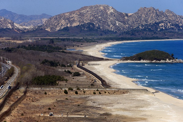 동해안 최북단 통일전망대에서 바라본 ‘DMZ 평화의 길’ 개설지역. ‘DMZ 평화의 길’은 해안 철책을 따라 남방한계선까지 이동 후 다시 좌측으로 금강산 전망대까지 이어진다. (사진=(c) 연합뉴스) |
