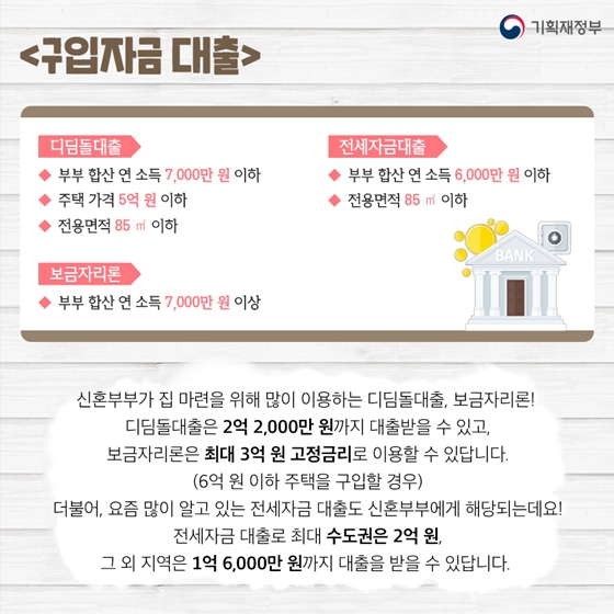 <구입자금 대출>신혼부부가 집 마련을 위해 많이 이용하는 디딤돌대출, 보금자리론! 디딤돌대출은 2억 2,000만 원까지 대출받을 수 있고, 보금자리론은 최대 3억 원 고정금리로 이용할 수 있답니다. (6억 원 이하 주택을 구입할 경우) 더불어, 요즘 많이 알고 있는 전세자금 대출도 신혼부부에게 해당되는데요! 전세자금 대출로 최대 수도권은 2억 원, 그 외 지역은 1억 6,000만 원까지 대출을 받을 수 있답니다.