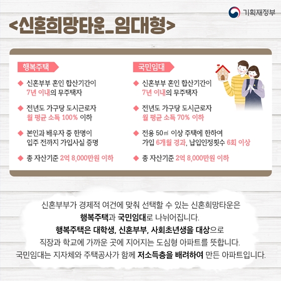 <신혼희망타운 임대형>신혼부부가 경제적 여건에 맞춰 선택할 수 있는 신혼희망타운은 행복주택과 국민임대로 나뉘어집니다. 행복주택은 대학생, 신혼부부, 사회초년생을 대상으로 직장과 학교에 가까운 곳에 지어지는 도심형 아파트를 뜻합니다. 국민임대는 지자체와 주택공사가 함께 저소득층을 배려하여 만든 아파트입니다.