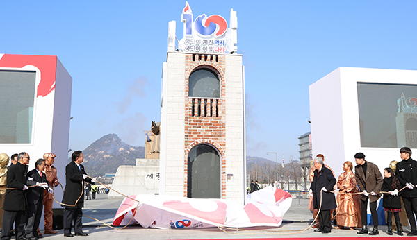 지난해 12월 20일 오후 서울 광화문 광장에서 열린 3·1운동 및 대한민국임시정부 수립 100주년 기념사업 홍보탑 제막식. (사진=(c) 연합뉴스)