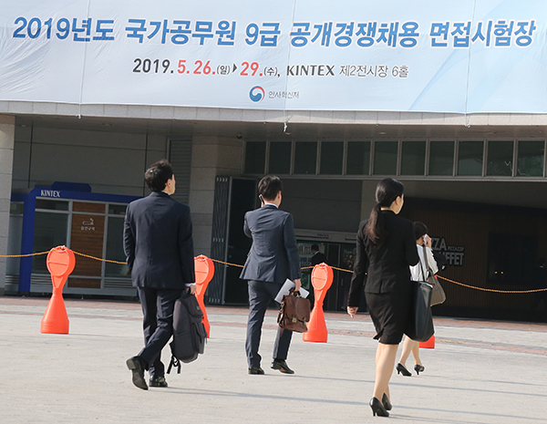 국가공무원 9급 공개경쟁채용 필기시험에 합격한 수험생들이 지난달 26일 경기 고양시 킨텍스 제2전시장에서 열린 공개채용 면접시험장으로 들어가고 있다. (사진=(c) 연합뉴스)