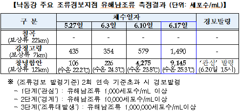 매주 이뤄지는 조류 측정 결과, 창녕함안 구간에서 '관심' 단계 발령기준(2회 연속* 유해남조류 1,000세포수/mL)을 초과하여 경보를 발령하게 되었다.