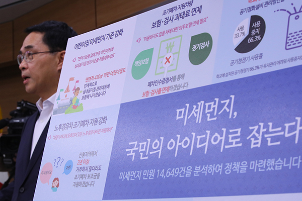 권태성 국민권익위원회 부위원장이 1일 ‘어린이·노인 등 미세먼지 취약계층 보호 강화, 노후경유차 조기폐차 및 친환경차 보급정책 지원, 미세먼지 유발 차량·선박·사업장 공익신고 대상 확대’ 등 국민의견을 담은 미세먼지 제도개선방안에 대해 설명하고 있다. (사진=(c) 연합뉴스) |