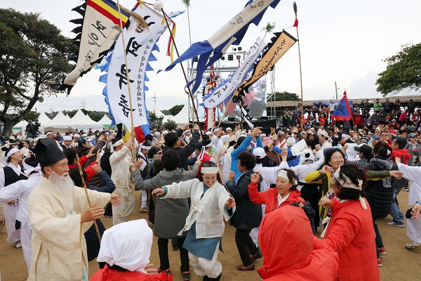 지난해 10월 제주 서귀포시 성읍민속마을에서 열린 제59회 한국민속예술축제 참가한 전국 15개 시·도 대표팀과 이북5도 대표팀, 관람객들이 함께 남북통일 염원 대동놀이를 펼치고 있다.(사진=(c) 연합뉴스)