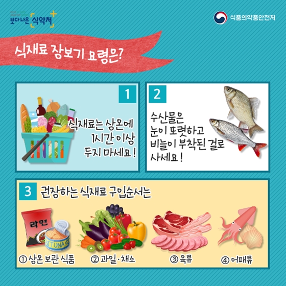 3. 권장하는 식재료 구입순서는 ‘상온 보관식품 – 과일·채소 – 육류 – 어패류’