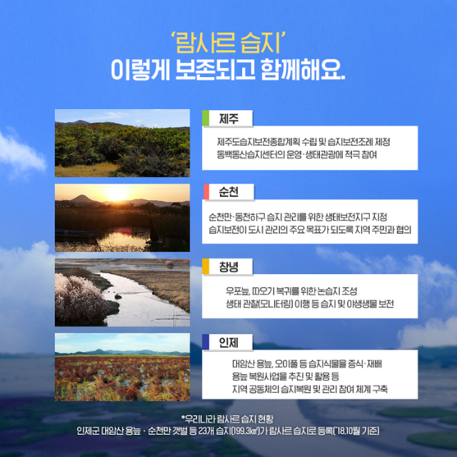 이후 지난해 10월 열린 ‘제13차 총회’에서 순천시, 창녕군, 인제군, 제주시 등 7개국 18개 도시가 최초로 람사르습지도시 인증을 받은 바 있다.