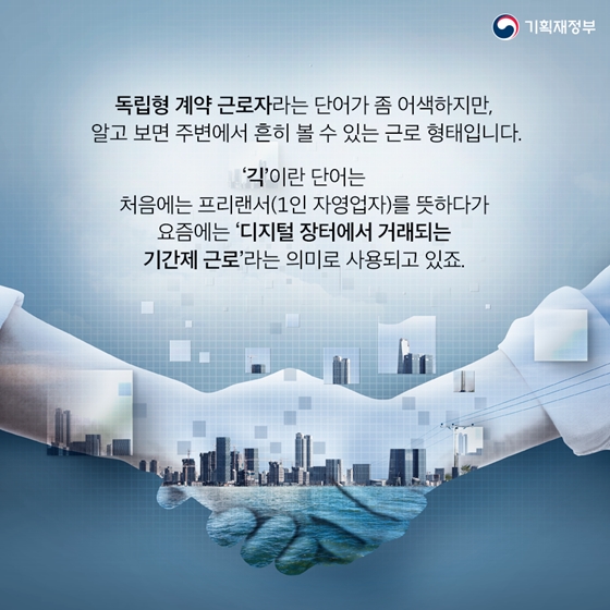 독립형 계약 근로자라는 단어가 좀 어색하지만, 알고 보면 주변에서 흔히 볼 수 있는 근로 형태입니다. ‘긱’이란 단어는 처음에는 프리랜서(1인 자영업자)를 뜻하다가 요즘에는 ‘디지털 장터에서 거래되는 기간제 근로’라는 의미로 사용되고 있죠.