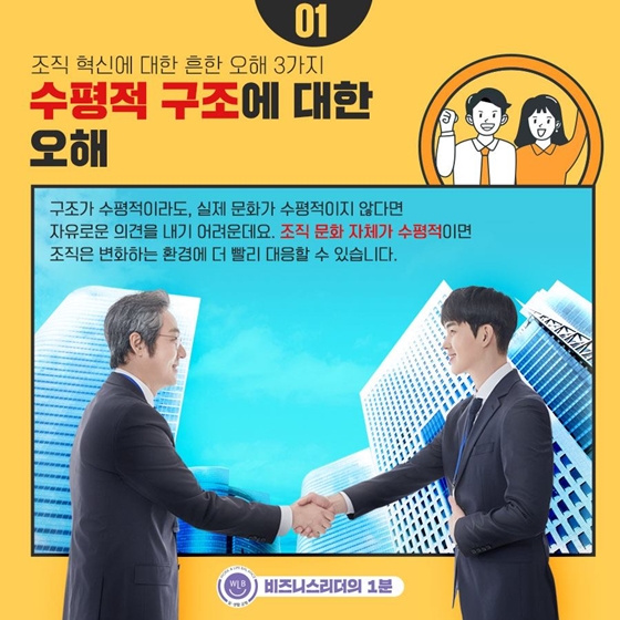 워라밸 문화가 확산되면서 호칭 파괴, 직급 간소화 도입 등 낡은 위계질서를 버리고 조직 혁신에 뛰어든 기업들이 늘어났는데요. 설문조사 결과에 따르면 직장인의 47%가 조직 문화의 변화를 체감하지 못했다고 답했습니다. 조직 혁신에 대한 흔한 오해 3가지를 정리해볼까요?