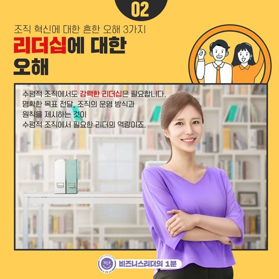 둘째, 리더십에 대한 오해 수평적 조직에서도 강력한 리더십은 필요합니다. 명확한 목표 전달, 조직의 운영 방식과 원칙을 제시하는 것이 수평적 조직에서 필요한 리더의 역량이죠.