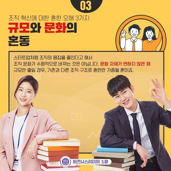 셋째, 규모와 문화의 혼동 스타트업처럼 조직의 몸집을 줄인다고 해서 조직 문화가 수평적으로 바뀌는 것은 아닙니다. 문화 자체가 변하지 않은 채 규모만 줄일 경우, 기존과 다른 조직 구조로 혼란만 가중될 뿐이죠.