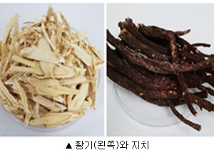 황기는 콩과에 속하는 다년생 식물로, 간장 보호, 면역 촉진, 항암 등의 효능이 있다. 지치는 지치과에 속하는 다년생 식물이며, 소염(염증 없앰), 해독, 해열 작용을 한다.