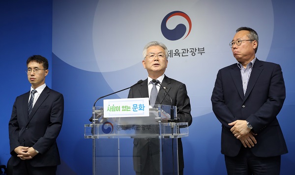 (왼쪽부터)안신영 문체부 영상콘텐츠산업과장, 김용삼 문체부 제1차관, 오석근 영화진흥위원회 위원장이 14일 정부세종청사 15동 문체부 기자실에서 ‘한국영화산업 발전 계획’을 발표하고 있다.(사진=문화체육관광부)