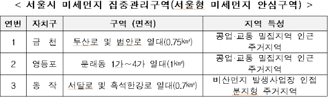 서울시는 25개 자치구 대상으로 수요조사 후 전문가로 구성된 자문위원회의 1차 서면평가와 2차 현장평가를 거쳐 최종 3개 자치구(금천·영등포·동작구)를 미세먼지 집중관리구역으로 선정했다.