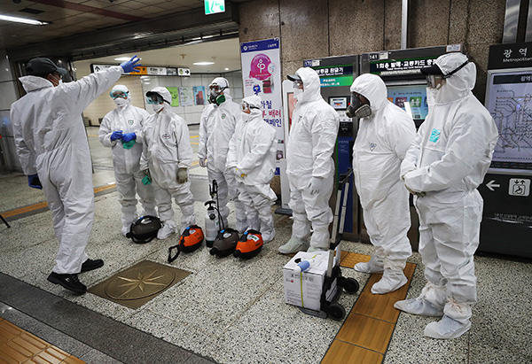 서울 동대문 인근 지하철역에서 관계자들이 방역작업을 준비하고 있다.(사진=(c) 연합뉴스)