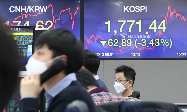 문체부는 17일 ‘패닉 셀링’은 ‘공황 매도’로, ‘블라인드 펀드’는 ‘투자처 미특정 기금’으로 대체해 쉬운 우리말 사용을 권장했다. 지난 13일 오후 서울 을지로 하나은행 본점 딜링룸 현황판에 코스피 종가가 나타나고 있다.(사진=(c) 연합뉴스)‘패닉 셀링’은 갑작스러운 요인으로 주가가 떨어질 때, 투자자들이 보유 주식을 마구 파는 일을 가리키는 말이다.