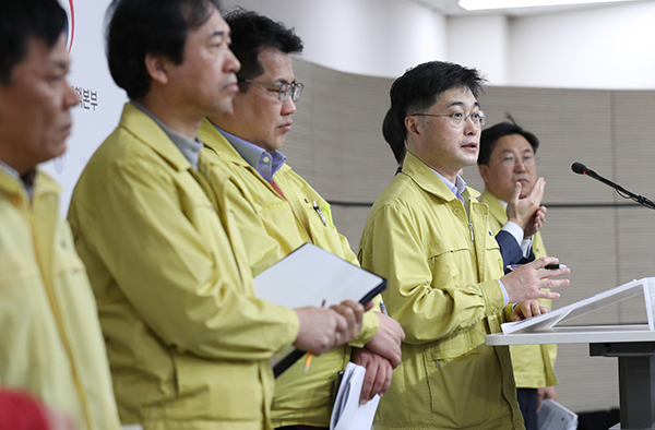 18일 윤태호 중앙사고수습본부 방역총괄반장(보건복지부 공공보건정책관, 오른쪽 두번째)이 세종시 보건복지부 브리핑실에서 코로나19 대응 중앙재난안전대책본부 회의 결과 정례브리핑 및 취재진의 질문에 답변하고 있다.정부는 소상공인 경영안정자금을 이번 추경을 통해 2조 7200억원 늘려 소상공인시장진흥공단에서 융자 형태로 지원하는 등 보다 많은 소상공인들에게 혜택이 돌아가도록 할 방침이다.