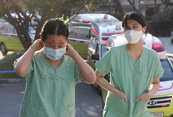 대구시 중구 계명대학교 대구동산병원에서 코로나19 확진자 진료활동을 마친 의료진이 마스크를 쓴 채 밖으로 나서고 있다.(사진=(c) 연합뉴스)면제기간은 19일 0시부터 코로나19 위기경보 단계가 ‘심각’에서 ‘경계’로 전환되는 당일 밤 12시까지로 하되 위기경보 단계와 별개로 최소 1개월은 적용하기로 했다.
