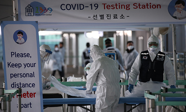 29일 오후 인천국제공항 2터미널에 마련된 선별진료소에서 유럽발 항공편 입국자가 코로나19 검사를 위해 입장한 뒤 진료소 관계자들이 테이블의 시트를 교체하고 있다. (사진=(c) 연합뉴스)이번 조치는 세계적으로 코로나19가 빠르게 확산되고 있는 만큼 해외에서 유입되는 감염요인을 차단하기 위한 강화 방안이다.