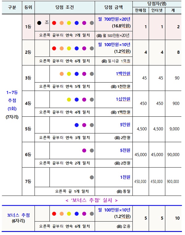 1등(7개 숫자 일치) 2명에게 20년 동안 매달 지급하는 당첨금(세전)은 500만원에서 700만원으로 올렸다. 기존 상품 출시 후 가구소득 증가, 물가 상승과 함께 해외 연금형 복권 사례를 고려해 금액을 설정했다는 것이 복권위의 설명이다.