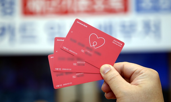 전주형 재난기본소득지원을 위한 선불카드인 ‘함께 하트 카드’. (사진=(c) 연합뉴스)선불카드 사용시 지원금을 신속하게 지급할 수 있고, 사용이 편리하며, 사용처·기간 제한 등을 통해 정책 목적을 달성할 수도 있다는 점에서다.
