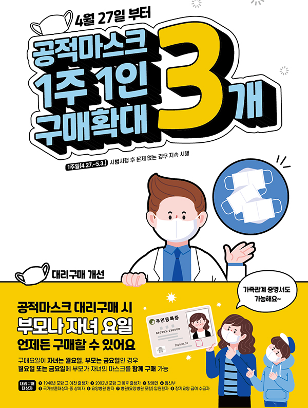 현재 공적 마스크 구매는 대리구매자와 대리구매 대상자의 구매 요일이 서로 다른 경우 판매처를 두 번 방문해야 했는데, 앞으로 자녀는 월요일이고 부모는 금요일인 경우 부모가 월요일 또는 금요일에 본인과 자녀의 마스크를 함께 구매할 수 있다.