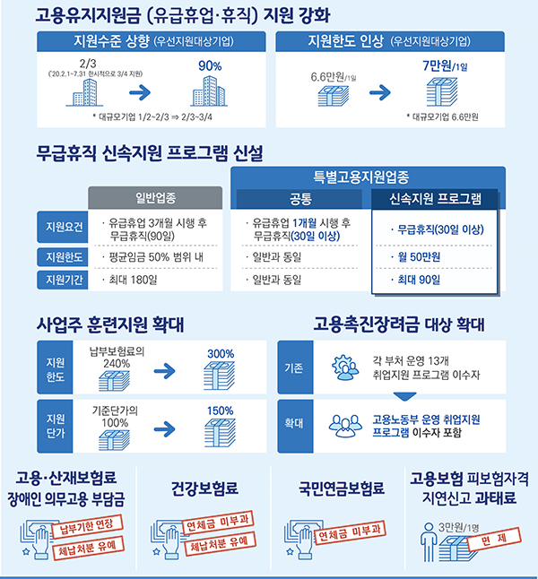 또한 근로자는 생활안정자금 융자 소득요건 완화, 직업훈련 생계비 대부 한도 증액, 국민내일배움카드 훈련비 자부담률 완화 등의 혜택을 받을 수 있다.