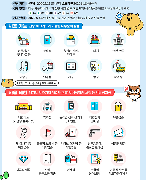 이번 긴급재난지원금은 코로나19로 어려워진 가계의 소득보전 외에도 소비진작과 지역경제 활성화에 도움이 되도록 사용처에 제한을 둔 것으로 백화점, 면세점, 대형마트(기업형 슈퍼마켓 포함), 대형전자판매점, 온라인 전자상거래는 불가하다.