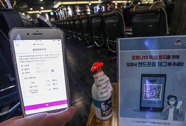 1일 서울 성동구의 한 PC방에서 직원이 입구에 비치된 QR코드를 스캔해 방문자의 모바일 전자 명부 작성 과정을 시연하고 있다. (사진=(c) 연합뉴스)방역 당국은 이태원 클럽 집단 감염 사례에서 유흥시설 등의 출입자 명부가 허위로 작성되어 신속하고 정확한 역학조사를 하는 데 많은 어려움을 겪었다.