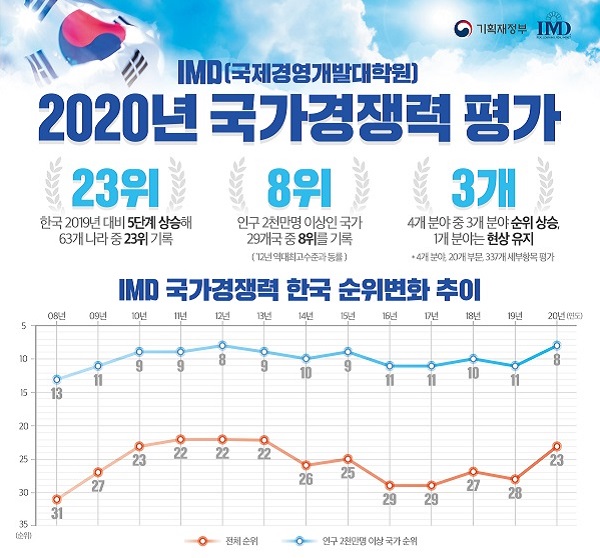 기획재정부는 2020년 IMD 국가경쟁력 평가에서 우리나라가 63개국 중 23위를 기록했다고 16일 밝혔다.