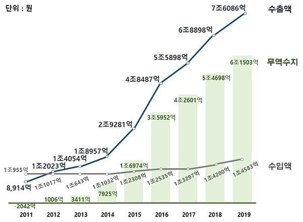 먼저 화장품 무역수지는 최근 8년 연속 흑자를 달성했다. 2015년 1조원, 2018년 5조원을 돌파한데 이어 2019년에는 6조원을 넘어섰다.