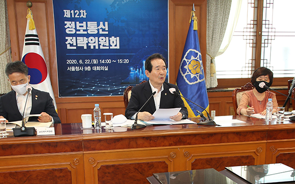 정세균 국무총리가 22일 정부서울청사에서 열린 정보통신전략위원회를 주재하며 발언하고 있다. 정 총리가 위원장을 맡고 있는 정보통신전략위원회는 ‘정보통신 진흥·융합 활성화 등에 관한 특별법’에 근거한 정보통신분야 주요 정책 의결기구다. (사진=(c) 연합뉴스)정부는 지난해 11월부터 약 40여 회에 걸친 산·학·연 전문가 의견 수렴 및 관계부처 합동 회의를 통해 총 55개의 과제를 발굴했다.