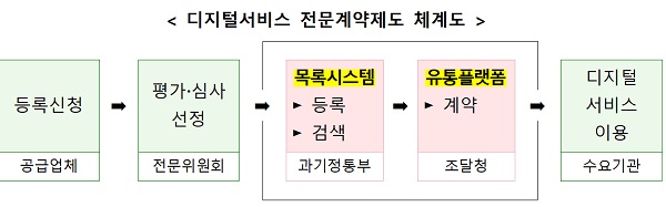 전문위원회는 공급업체 신청을 받아 서비스를 심사·평가, 공공계약 대상이 될 디지털서비스 목록을 작성하고 수요기관은 작성된 디지털서비스 목록 중에서 원하는 서비스를 자유롭게 선택·구매할 수 있게 된다.
