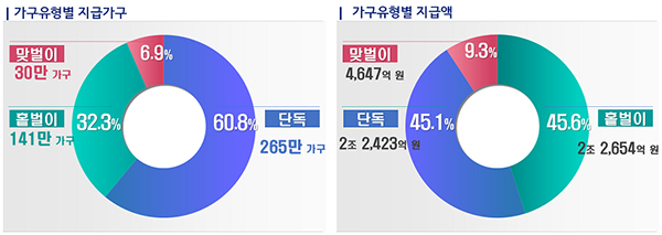 지급가구 수는 단독 가구가 265만 가구(60.8%)로 가장 큰 비중을 차지했고, 홑벌이 가구는 141만 가구(32.3%), 맞벌이 가구는 30만 가구(6.9%)로 나타났다.