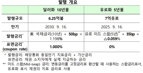 이번 외평채는 10년 만기 미 달러화 표시 채권 6억2500만 달러와 5년 만기 유로화 표시 채권 7억 유로로 나눠 발행됐다. 특히 유로화 표시 외평채는 2014년 6월 이후 약 6년 만에 발행된 것이다.